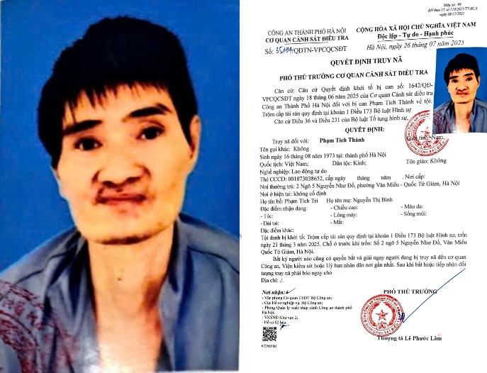 Cơ quan CSĐT Công an TP Hà Nội đã ra quyết định truy nã đối tượng Phạm Tích Thành (SN: 1973; thường trú tại: ngõ 5 Nguyễn Như Đổ, phường Văn Miếu - Quốc Tử Giám, TP Hà Nội) về tội Trộm cắp tài sản.