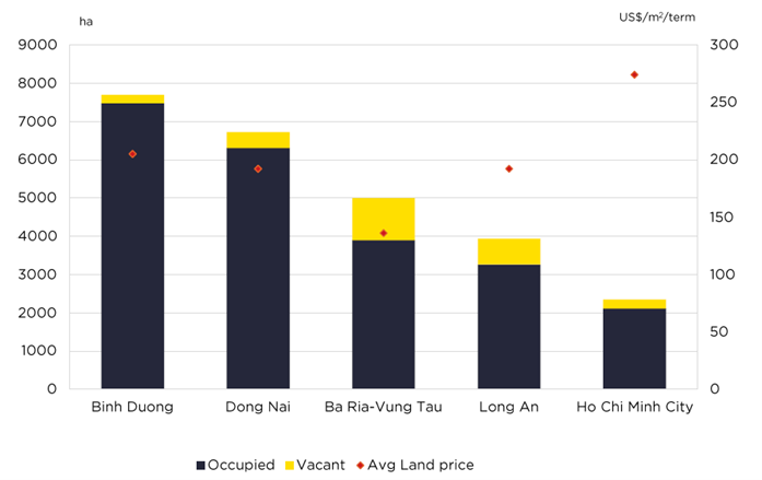 Trong nửa cuối năm 2025, khu vực SEZ ghi nhận 25.700 ha đất khu công nghiệp đang hoạt động, với tỷ lệ lấp đầy bình quân khoảng 90%. Một số thị trường trọng điểm như Bình Dương, Đồng Nai và TP.HCM có tỷ lệ lấp đầy vượt 90%, trong khi Long An và Bà Rịa - Vũng Tàu vẫn còn dư địa nhờ quỹ đất mới và vị trí chiến lược dọc các trục hạ tầng đang hình thành.