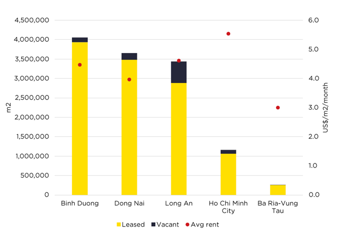 Giá thuê trung bình đạt 4,4 USD/m²/tháng, phản ánh nhu cầu cao từ các doanh nghiệp sản xuất, logistics và thương mại điện tử, những lĩnh vực phụ thuộc lớn vào khả năng kết nối nhanh và chi phí vận hành hiệu quả.