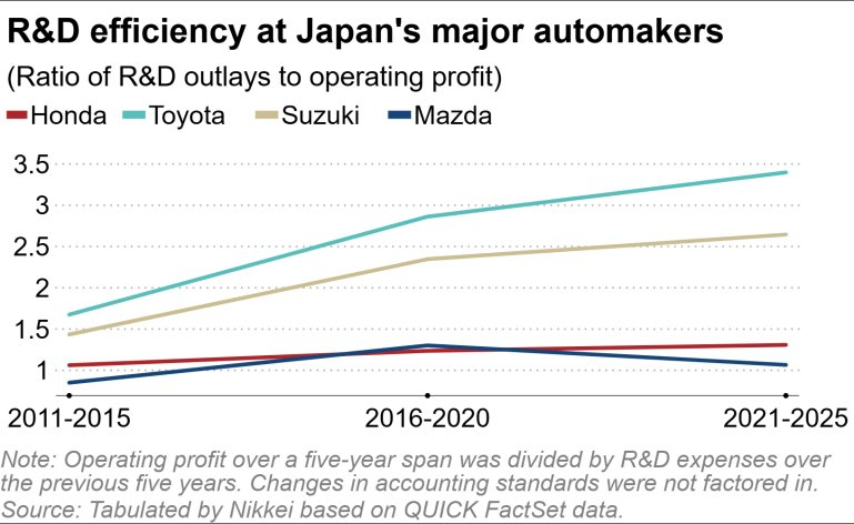 Hiệu quả nghiên cứu và phát triển (R&D) của Honda hiện ở mức thấp so với các đối thủ đồng hương. Chỉ số hiệu quả R&D của hãng trong 5 năm qua chỉ đạt 1,3, kém xa mức 3,4 của Toyota và 2,6 của Suzuki.
