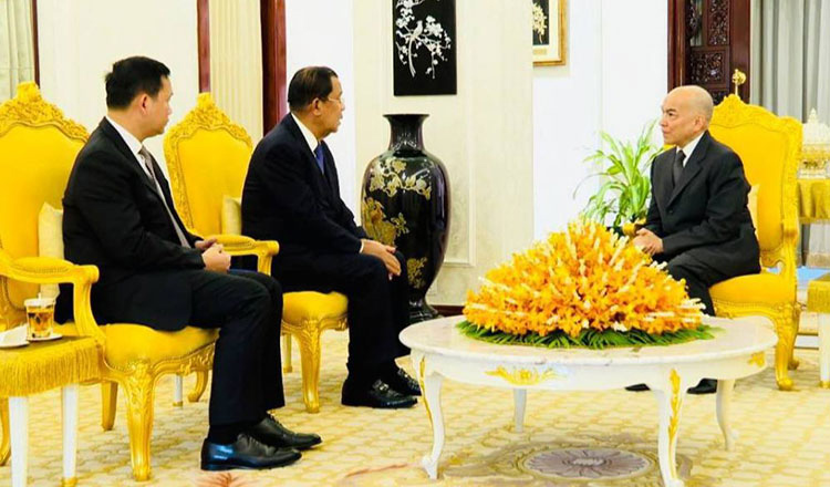 Quốc vương Campuchia Preah Bat Samdech Preah Boromneath Norodom Sihamoni (phải) vào ngày 4/8 đã ban hành sắc lệnh hoàng gia ủy quyền cho Chủ tịch Hội đồng Cơ mật tối cao Hun Sen (giữa) liên lạc với Thủ tướng Hun Manet (trái) về các vấn đề liên quan đến quốc phòng và phối hợp quân sự của vương quốc này. Ảnh: Khmer Times