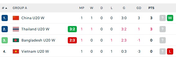 Việc Thái Lan thắng sát nút giúp họ leo lên đứng nhì bảng A, dưới U20 nữ Trung Quốc sau lượt trận mở màn. U20 nữ Bangladesh tạm đứng thứ 3 trong khi U20 nữ Việt Nam bị đẩy xuống đứng cuối BXH.