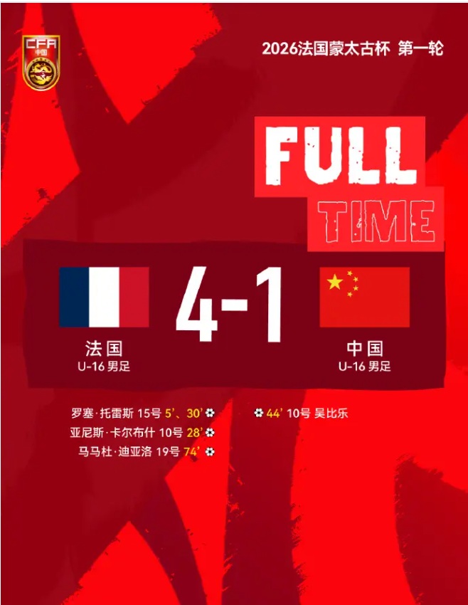 Đến phút 44, U16 Trung Quốc bất ngờ có bàn gỡ xuống còn 1-3 nhờ một khoảnh khắc tỏa sáng cá nhân. Tuy nhiên, đó cũng là tất cả những gì đại diện từ châu Á có thể làm được. Trong hiệp hai, U16 Pháp vẫn thi đấu hoàn toàn lấn lướt. Dù không đẩy cao nhịp độ tấn công nhưng họ vẫn có thêm 1 bàn thắng nữa ở phút 74, ấn định tỷ số chung cuộc 4-1.