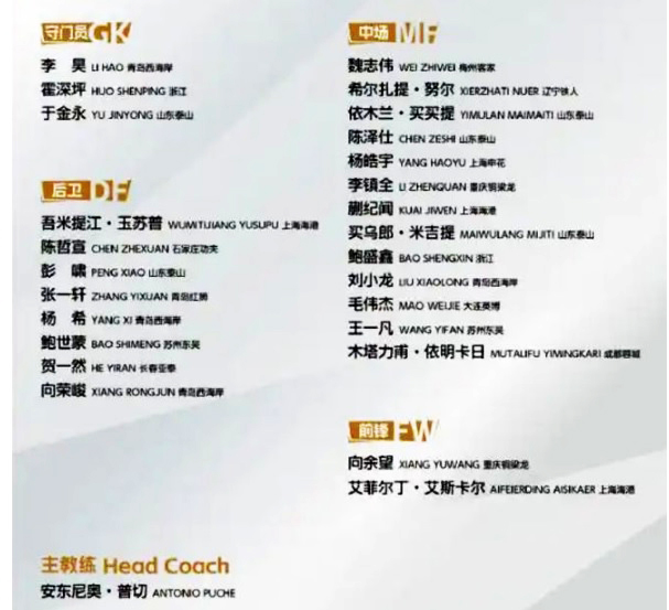 8 cầu thủ thuộc lứa U20 gồm Yi Mulan, Kuai Jiwen, Mao Weijie, Yang Xi, Peng Xiao, Chen Zeshi, He Yiran và Wang Yifan.
