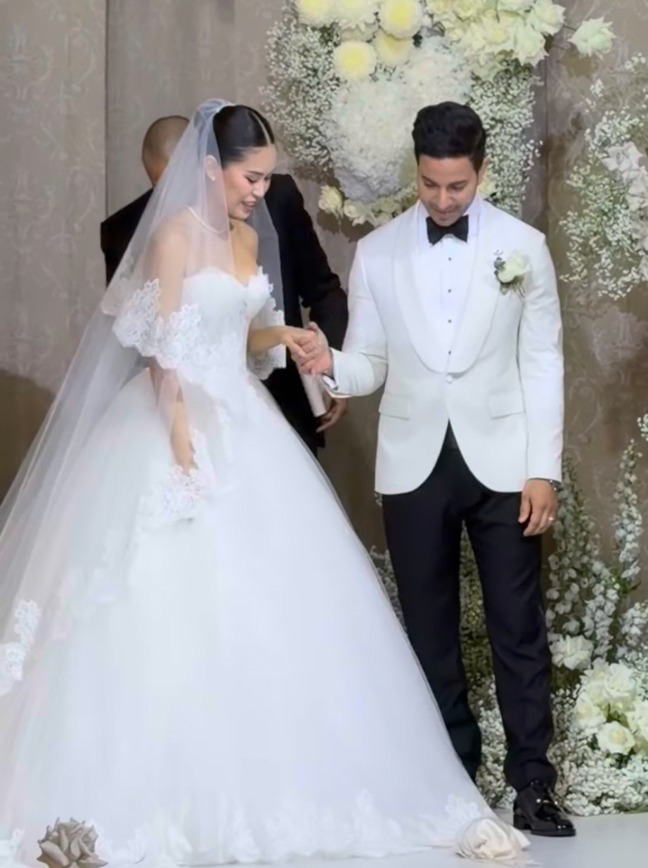 Chú rể Justin Cohen là người Canada gốc Dubai, hoạt động trong ngành quảng cáo ở Việt Nam. Hai người hẹn hò kín đáo nhiều năm và chưa từng công khai mối quan hệ.