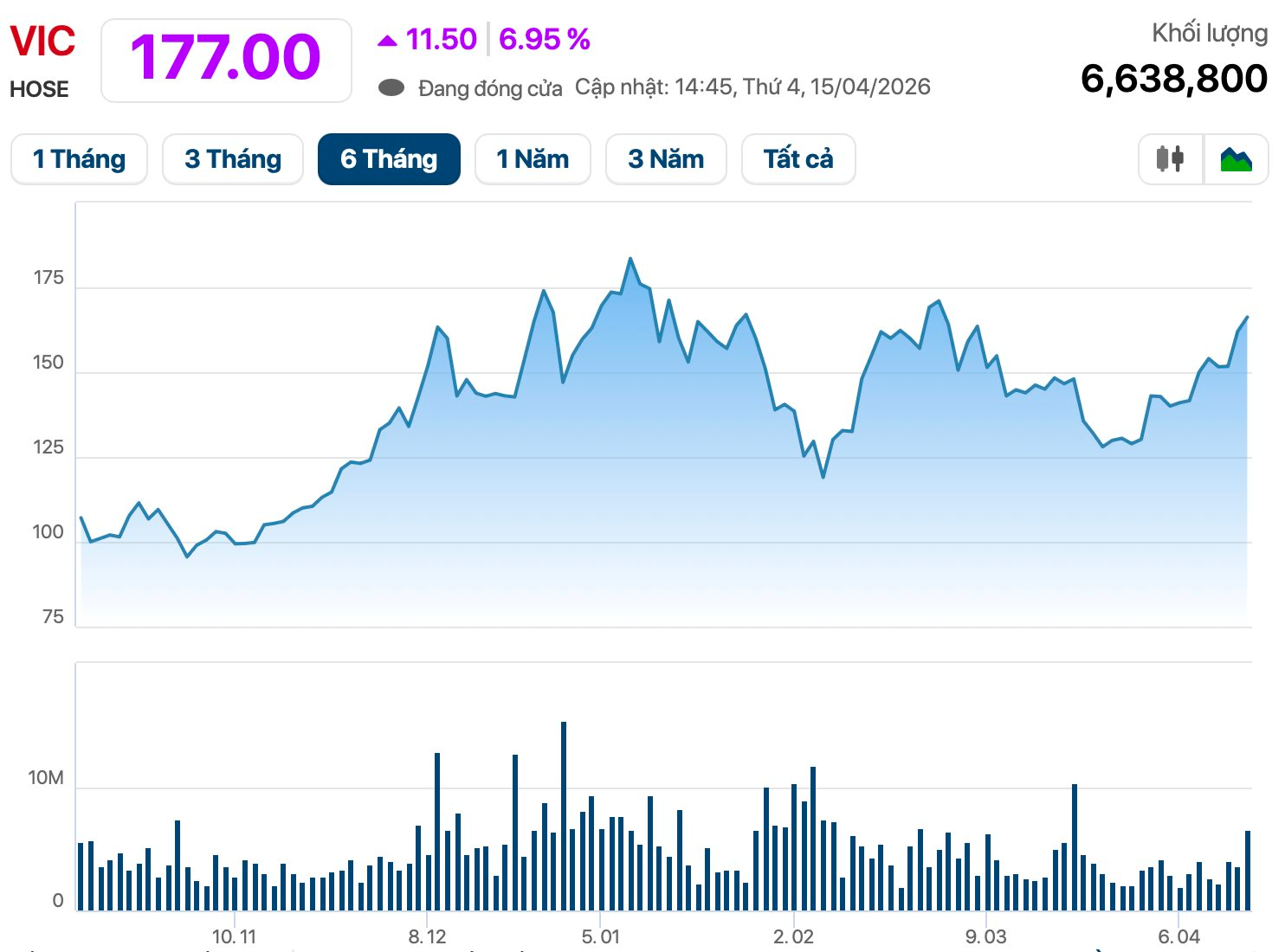 Cổ phiếu VIC của Vingroup vừa có phiên tăng kịch trần lên mức 177.000 đồng/cp, chỉ kém đôi chút so với đỉnh lịch sử ghi nhận ngày 7/1/2026. Vốn hóa thị trường tương ứng đạt hơn 1,3 triệu tỷ đồng, bỏ xa những cái tên còn lại trên sàn chứng khoán Việt Nam. Nếu tính chung cả hệ sinh thái đang niêm yết, giá trị vốn hóa nhóm Vingroup lên đến 2 triệu tỷ đồng, chiếm hơn 20% toàn sàn HoSE.