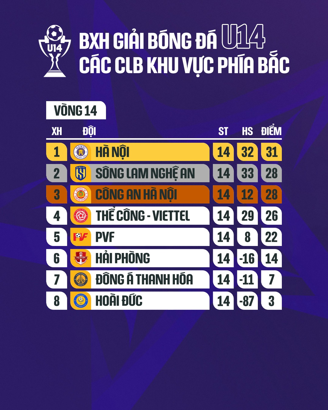 Kết quả giải U14 miền Bắc 2025/26.