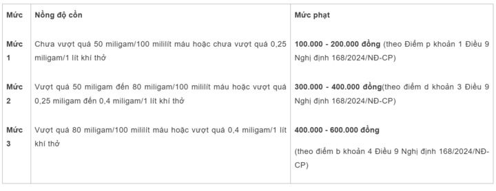 - Mức phạt nồng độ cồn với ô tô: Theo Nghị định 168/2024/NĐ-CP có hiệu lực từ ngày 1/1/2025, mức phạt nồng độ cồn đối với người điều khiển ô tô được quy định cụ thể theo 3 mức vi phạm nồng độ cồn, dưới đây là 3 mức phạt tương ứng với 3 ngưỡng nồng độ cồn khác nhau: