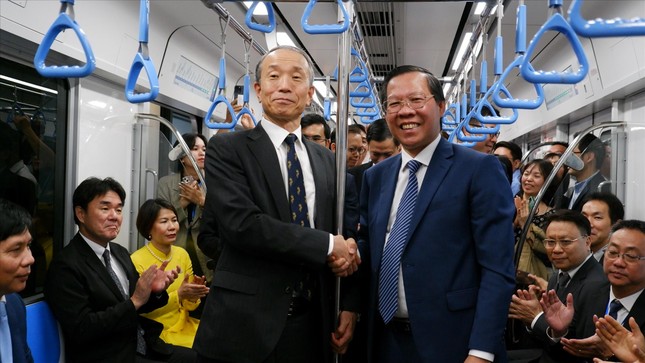Chủ tịch UBND TPHCM Phan Văn Mãi (bên phải) cùng ông ONO Masuo - Tổng Lãnh sự Nhật Bản tại TPHCM trải nghiệm tàu metro số 1. Ảnh: Hữu Huy