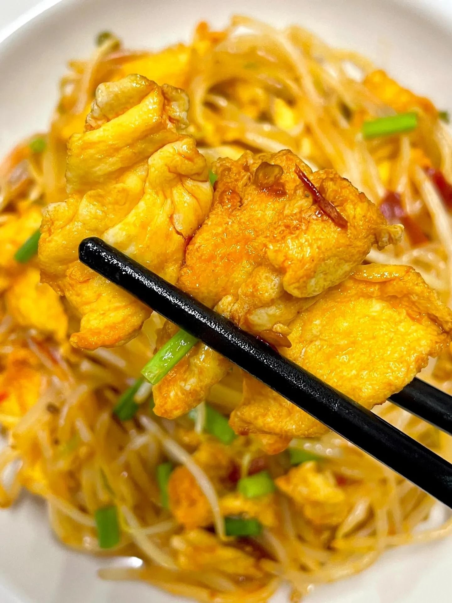 Đặt chảo lên bếp, cho một chút dầu ăn vào và đun nóng. Khi dầu đã nóng, đổ trứng vào chảo. Đợi trứng hơi săn lại thì dùng đũa đảo đều nhẹ tay để trứng tơi ra thành những tảng nhỏ giống như trứng rối. Trứng rối sẽ giúp món ăn có kết cấu hấp dẫn hơn.