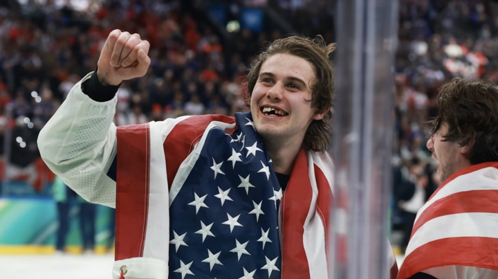 Sau bàn thắng vàng lịch sử giúp tuyển Mỹ đăng quang Olympic, Jack Hughes không giấu được niềm vui khi trở thành người hùng trong trận chung kết nghẹt thở.