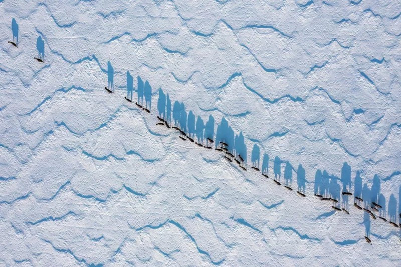 Tác phẩm “Đoàn lữ hành” của Dmitry Golubev, vùng Oryol. Đàn bò rừng di chuyển trên cánh đồng phủ tuyết, kéo dài thành chuỗi dài. Ảnh chụp từ độ cao lớn, không làm ảnh hưởng đến đàn vật.