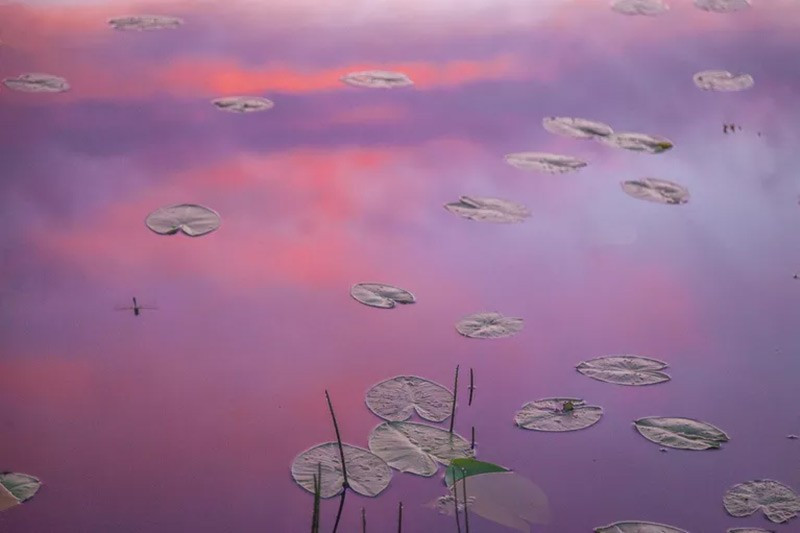 Tác phẩm "Theo dấu Monet” của Stanislav Napalkin, Khu bảo tồn Valdai, Novgorod. Thực vật thủy sinh dưới ánh bình minh rực rỡ gợi nhớ tranh của danh họa Pháp. Mỗi năm tác giả đều tìm cách khai thác góc nhìn này.