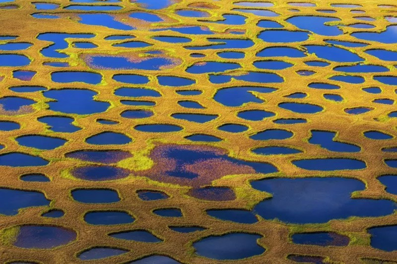 Tác phẩm “Hươu cao cổ Tundra” của Elena Shchipkova, Khu bảo tồn Ust-Lensky, Yakutia. Từ trực thăng, mạng lưới hồ nhỏ ở Bắc Cực tạo hình như da loang của hươu cao cổ. Từ mặt đất, cảnh quan lại hoàn toàn khác biệt.