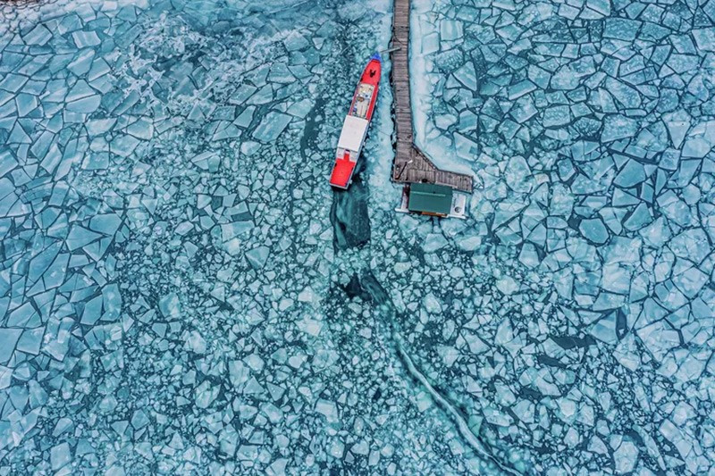 Tác phẩm “Trong xiềng xích băng” của Kirill Sergeev, vịnh Kurkutsky, hồ Baikal. Con tàu neo bên bờ bị bao quanh bởi lớp băng đầu mùa thu, thường xuất hiện cuối tháng 10–11 tại các vịnh nông nơi nước lạnh nhanh hơn.