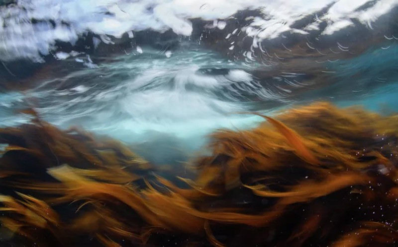 Tác phẩm “Xao động” của Andrey Narchuk, đảo Moneron, Sakhalin. Khi biển động, rừng tảo dưới nước bị sóng và dòng chảy ép sát vào đá, cố bám trụ. Tác giả ghi lại khoảnh khắc thiên nhiên đầy sức sống này.