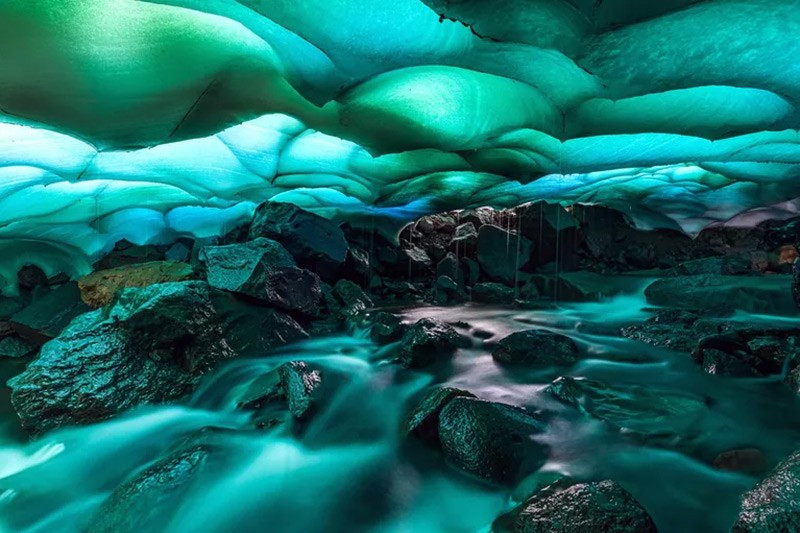 Tác phẩm "Hang ngọc lục bảo” của Svetlana Grigorieva, Kamchatka, gần núi lửa Mutnovskaya Sopka. Lối vào hang thấp buộc phải cúi người, song vẻ đẹp thiên nhiên bên trong khiến quên hết khó khăn.
