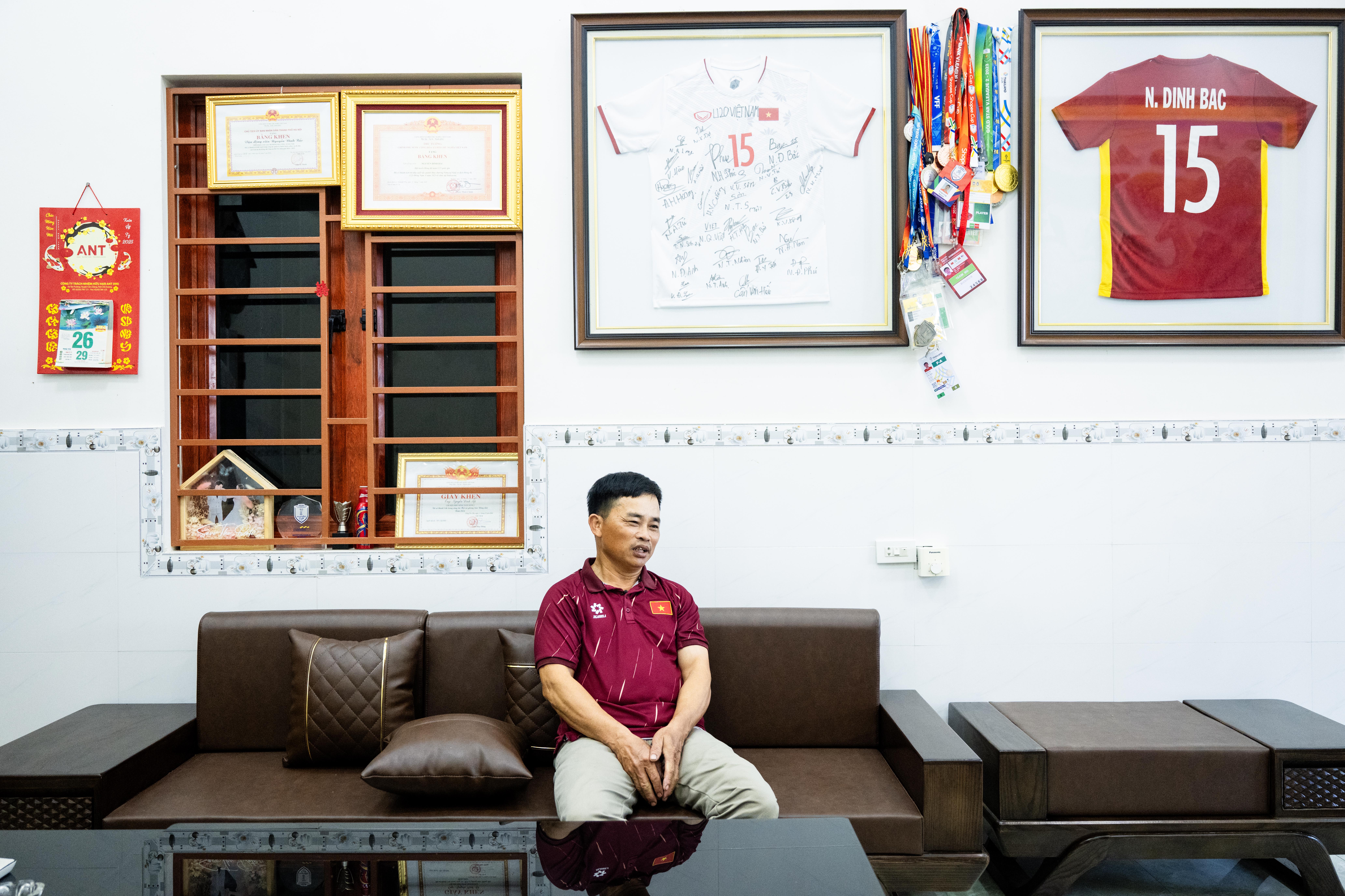 Bên trong căn nhà với những tấm huy chương, chiếc áo đầy kỷ niệm của Đình Bắc được đóng khung treo trong nhà (Ảnh: Như Hoàn)