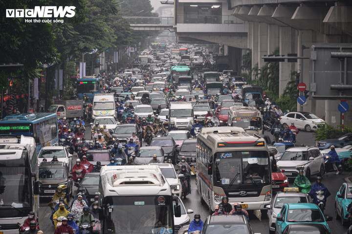 Lưu lượng ô tô, xe máy dày đặc trên các tuyến phố thải ra lượng lớn khí và bụi, trở thành một trong những nguồn gây ô nhiễm không khí đáng kể tại Hà Nội. (Ảnh: Viên Minh)