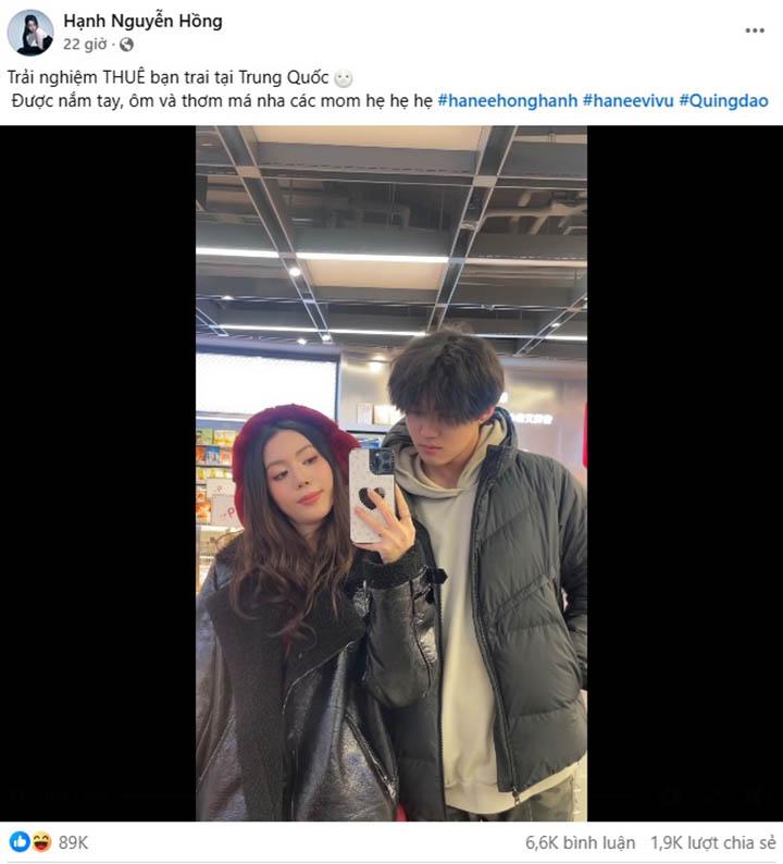 Theo đó, Nguyễn Hồng Hạnh (sinh năm 1997, tại Hà Nội) - người mẫu, TikToker sở hữu 322k người theo dõi đã đăng tải đoạn clip đi chơi với “hồng hài nhi” nhờ dịch vụ cho thuê bạn trai tại Trung Quốc. Cô cho biết, đã biết đến dịch vụ này nên khi đang du lịch tại Thanh Đảo (Trung Quốc) đã quyết định trải nghiệm thử.