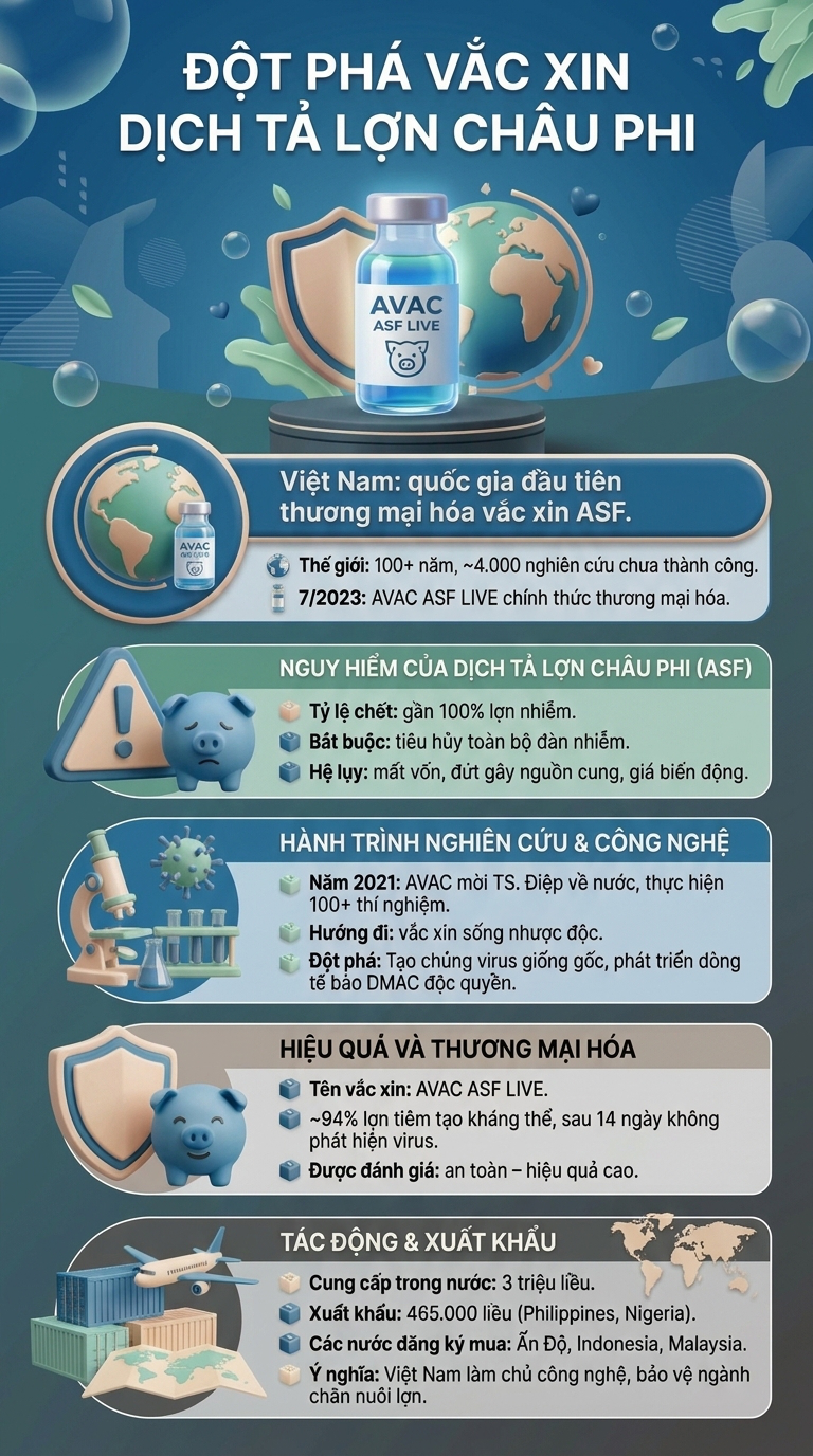 Tháng 7/2022, vắc xin AVAC ASF LIVE được cấp phép lưu hành có giám sát, cho thấy khoảng 94% lợn tiêm tạo kháng thể. Đến tháng 7/2023, vắc xin chính thức được thương mại hóa và xuất khẩu, với hàng triệu liều đã được sử dụng. Thành tựu này khẳng định năng lực khoa học của Việt Nam, mở ra hướng đi mới cho ngành thú y và chăn nuôi toàn cầu.