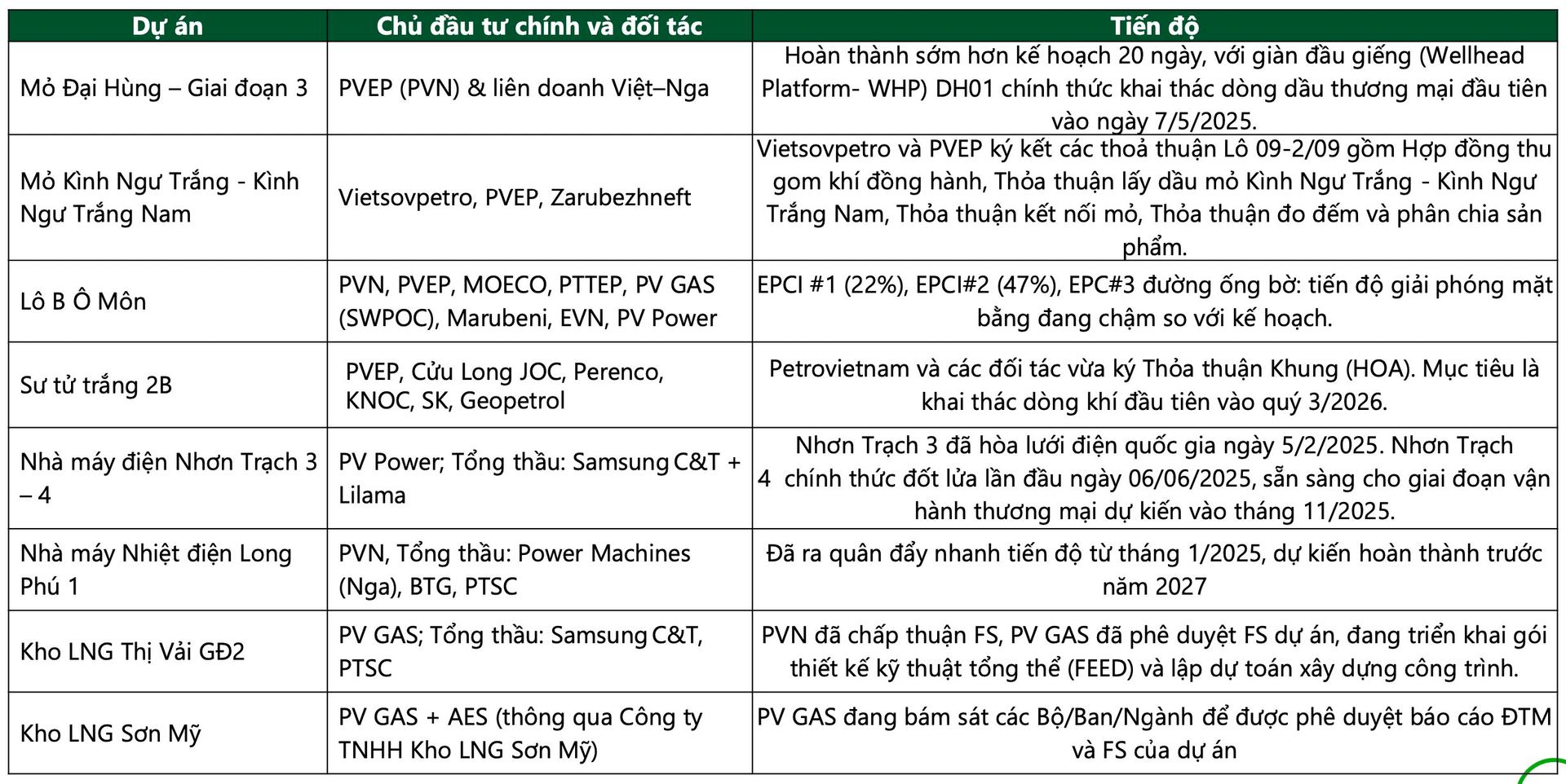 + PVN đã phát triển mỏ Đại Hùng pha 3 hoàn thành trước kế hoạch 20 ngày, do 100% lực lượng kỹ thuật người Việt trong hệ sinh thái PVN thực hiện, góp phần tăng sản lượng và bảo đảm nguồn nguyên liệu cho sản xuất điện mùa khô, đặc biệt cho các nhà máy điện khí Nhơn Trạch 3 và 4.