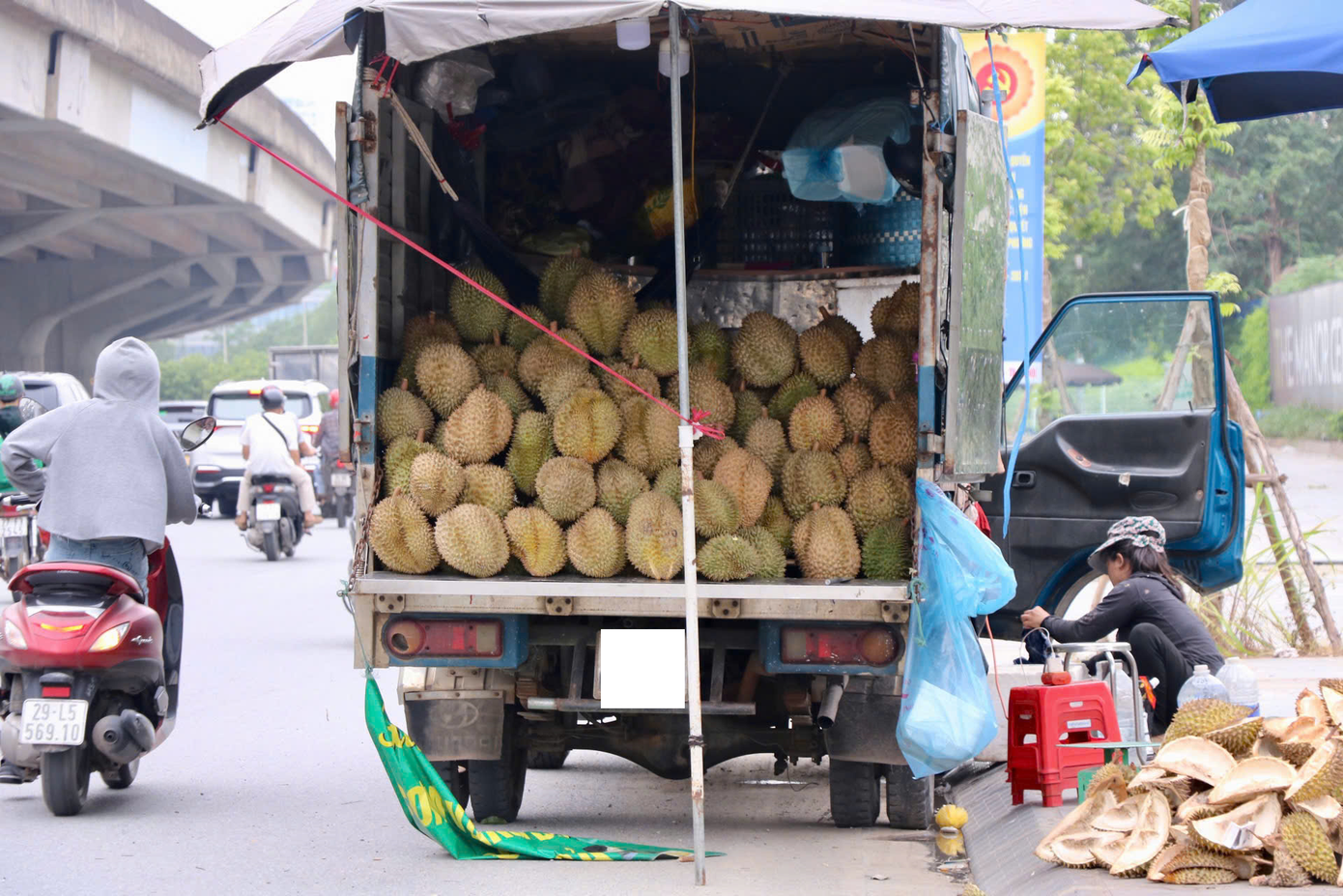 Ghi nhận của PV Tiền Phong cho thấy, tại đường Nguyễn Xiển (TP. Hà Nội) nhiều lô sầu riêng đang được bày bán với giá 35.000 đồng/kg chủ yếu là những quả nhỏ chỉ tầm 800 gram đến 1kg, không rõ giống. Trong khi đó, các loại có nhãn Ri6, Thái lép… vẫn có giá 45.000 - 60.000 đồng/kg. Trên mạng xã hội cũng xuất hiện hàng loạt bài đăng, rao bán sầu riêng với giá chỉ 25.000 - 30.000 đồng/kg, kèm theo quảng cáo “chín cây, không sượng”.