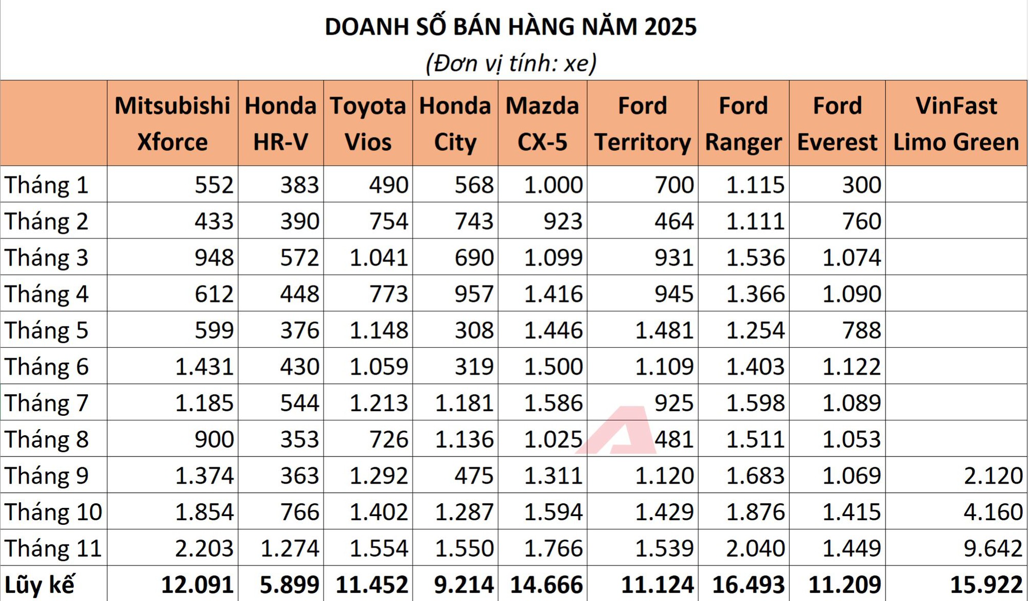 Ở nhóm CUV cỡ B, Mitsubishi Xforce và Honda HR-V đều ghi nhận tháng bán hàng tốt nhất kể từ đầu năm. Xforce đạt doanh số 2.203 xe trong tháng 11, vượt qua mức đỉnh cũ 1.854 xe của tháng 10, đồng thời cho thấy đà tăng rất rõ rệt kể từ quý IV.