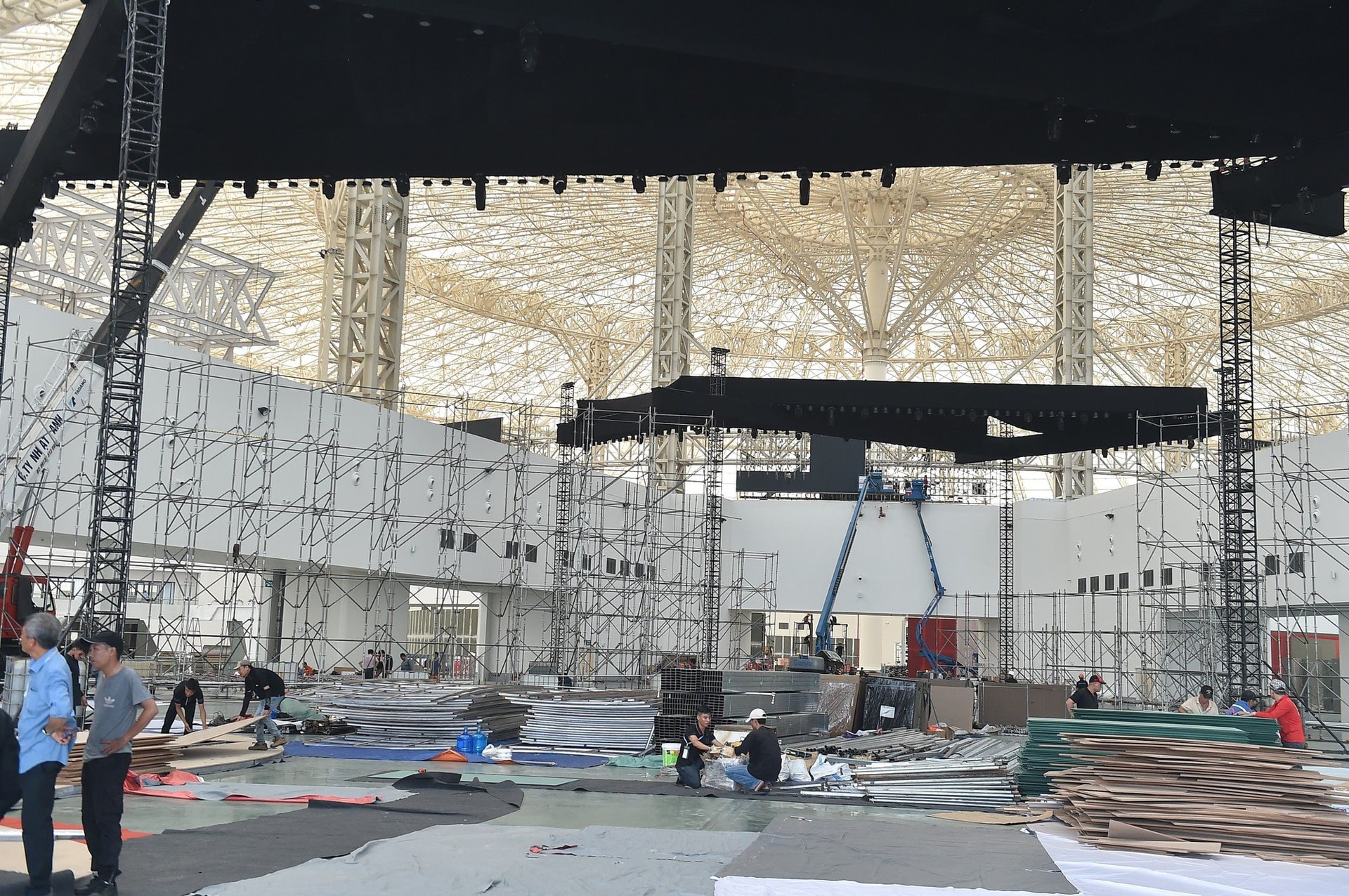 Các đơn vị thi công phục vụ Triển lãm, chiều 11/8. Ảnh: VPG