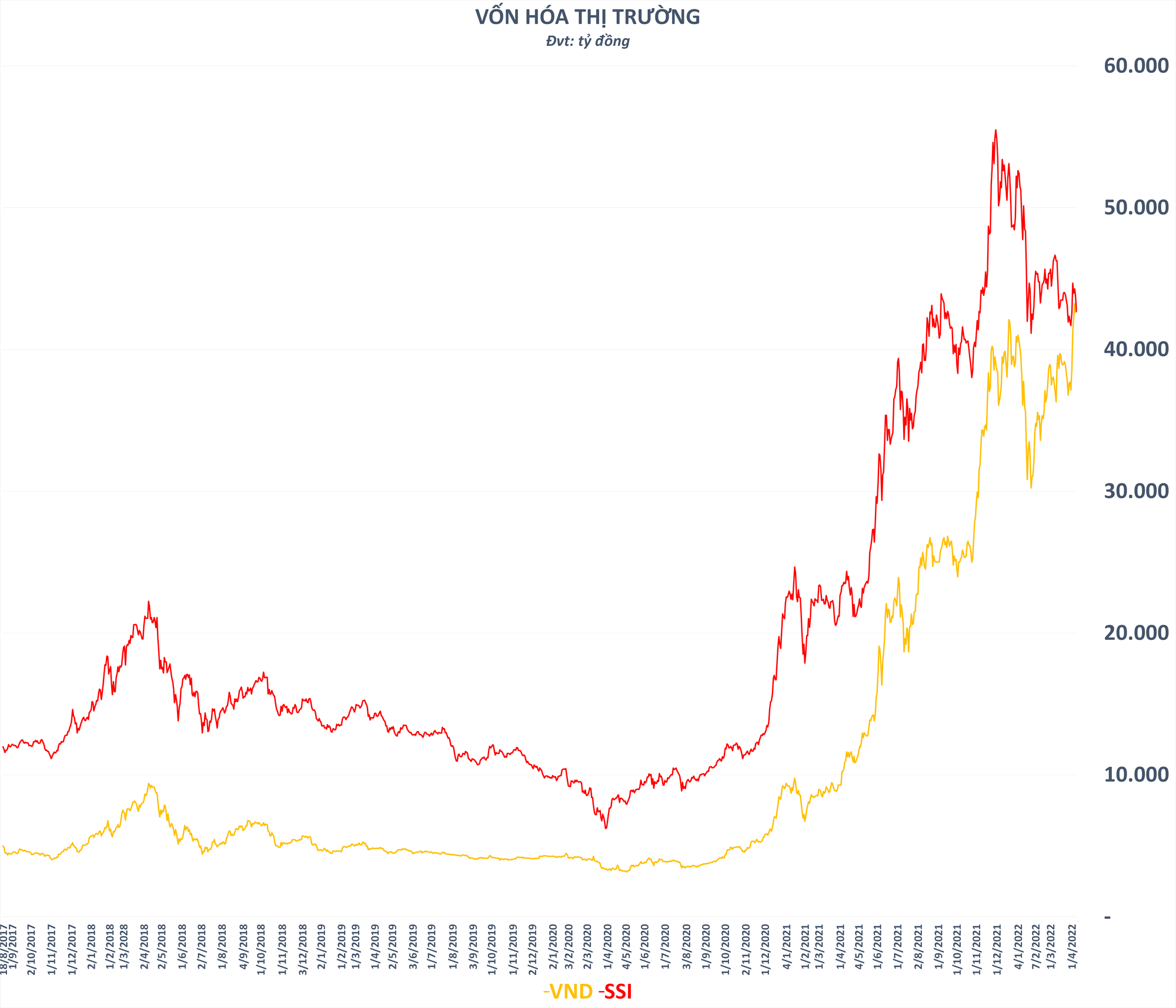 Xuất phát muộn hơn, VNDirect lần đầu niêm yết trên HNX vào năm 2010 với vốn điều lệ 1.000 tỷ đồng tại thời điểm đó. Đến tháng 8/2017, CTCK này mới chuyển sàn giao dịch sang HoSE nhưng vốn hóa thị trường chỉ dưới 5.000 tỷ đồng, chưa bằng một nửa SSI thời điểm đó. Không khó để nhận ra VNDirect đã phải núp sau cái bóng quá lớn của SSI trong nhiều năm trước khi bước ngoặt mang tên Covid-19 xuất hiện.