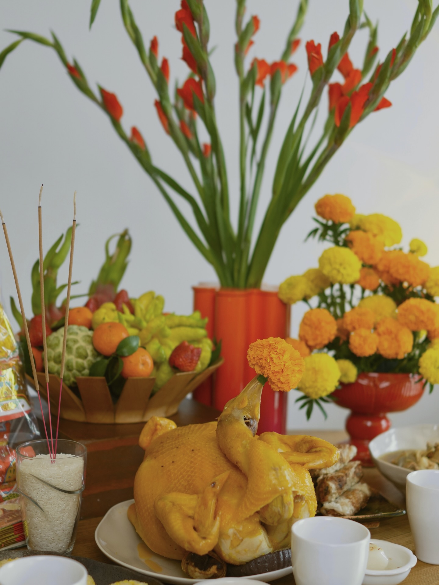 Vợ Giám đốc Nhà hát Chèo Quân đội, NSND Tự Long chuẩn bị tươm tất, chuẩn mực. Trên ban thờ được chăm chút đẹp mắt, bà mẹ 3 con bày biện đủ đầy cỗ cúng với gà luộc buộc cánh tiên, giò lựa, xôi gấc, cá chép, trang trí hoa quả. Đúng phong cách truyền thống Bắc Bộ.