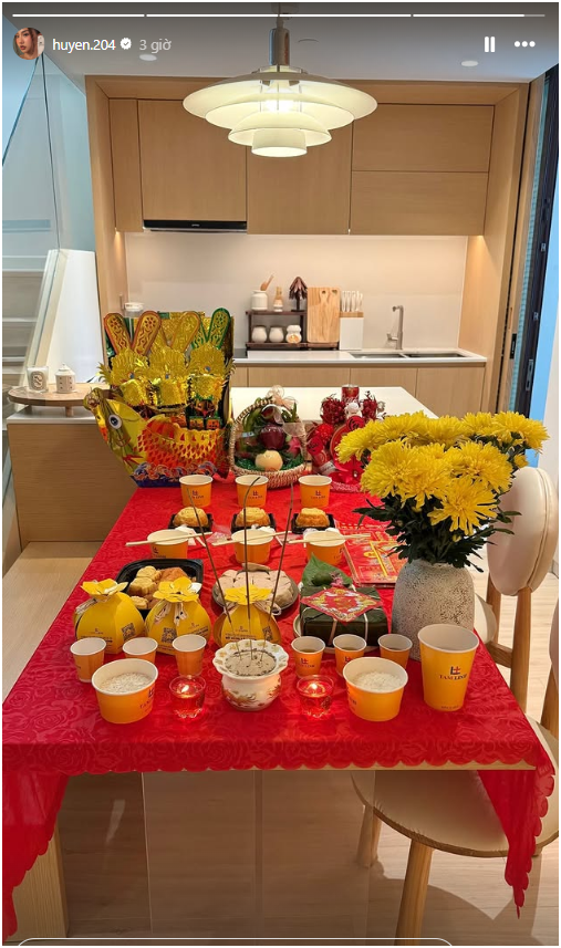 Không chỉ chuẩn bị lễ vật đầy đủ, Doãn Hải My còn ghi điểm bởi cách bày trí gian thờ Phật và gia tiên gọn gàng, chỉn chu, đúng lễ nghi. Ở bàn thờ Phật, cô trưng hoa tươi như lan hồ điệp, cúc vàng, bánh trái và hoa quả. Bàn thờ gia tiên cũng được chăm chút không kém với mâm cúng mặn gồm gà luộc, xôi,... tạo nên tổng thể hài hòa, ấm cúng và đẹp mắt.