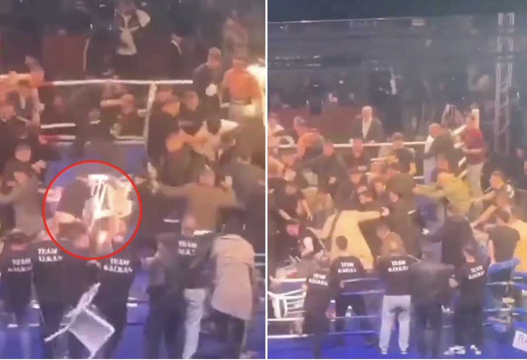 Chỉ vài giây sau, hai ê-kíp lao vào hỗn chiến ngay trên sàn. Và mọi thứ nhanh chóng leo thang thành “đại chiến” khi hàng chục khán giả tràn vào võ đài, biến trận đấu chuyên nghiệp thành một cuộc ẩu đả kiểu đường phố.