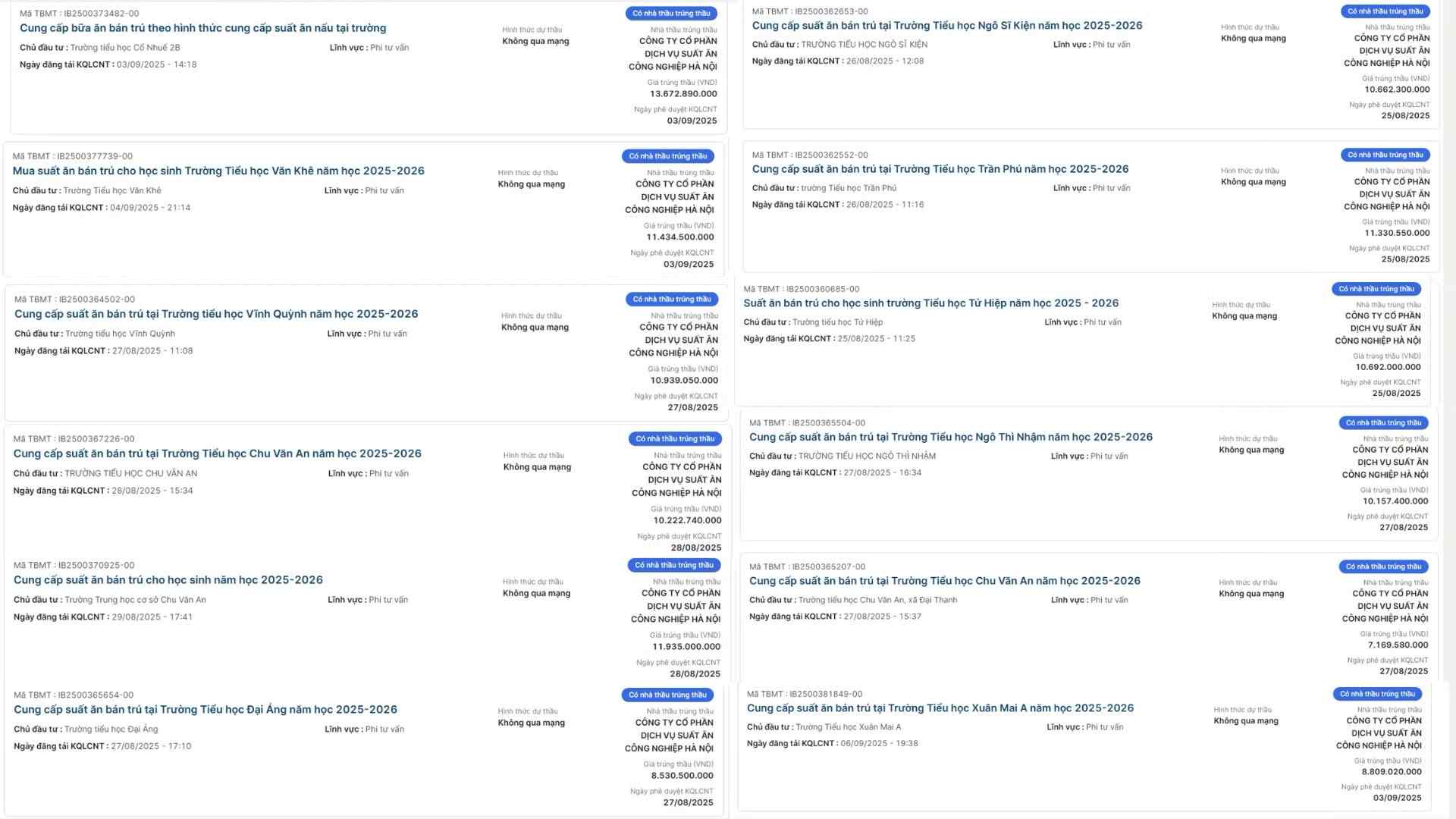 Ngoài ra, trong năm học 2025-2026, Công ty cổ phần Dịch vụ Suất ăn công nghiệp Hà Nội cũng trúng nhiều gói thầu tiền tỷ tại các địa phương khác như Bắc Ninh, Hưng Yên, Ninh Bình.
