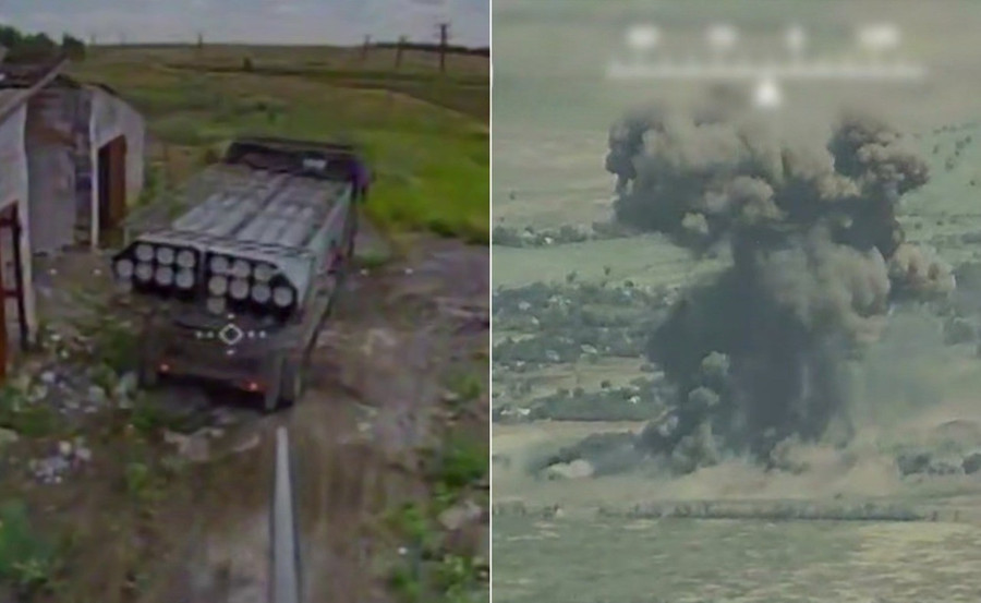 Đoạn video cho thấy người điều khiển UAV sử dụng máy bay không người lái tấn công từ xa và bắn trúng một trong những quả đạn đã sẵn sàng trên giàn phóng.