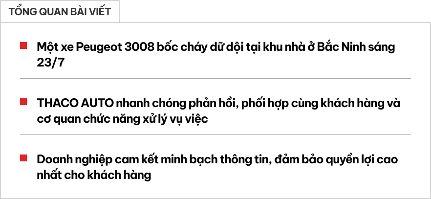 Đại diện THACO AUTO cho biết, ngay khi tiếp nhận thông tin vụ cháy, lãnh đạo công ty chi nhánh Bắc Ninh đã có mặt tại hiện trường để phối hợp với khách hàng và tiếp xúc với cơ quan chức năng ghi nhận sự việc. Đồng thời, THACO cũng đã báo cáo sự việc với hãng Peugeot nhằm chuẩn bị sẵn sàng cung cấp thông tin kỹ thuật và hỗ trợ khi có yêu cầu, đảm bảo quyền lợi cao nhất cho khách hàng.