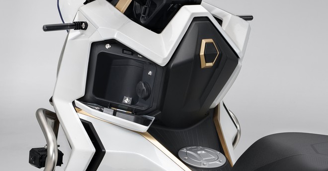 Một số thiết kế khác cũng nhằm hỗ trợ di chuyển đường dài còn có bàn để chân nghiêng phía trước, ống xả đặt cao, cốp dưới yên dung tích 36 lít, hộc đồ phụ phía trước tích hợp cổng sạc điện thoại.