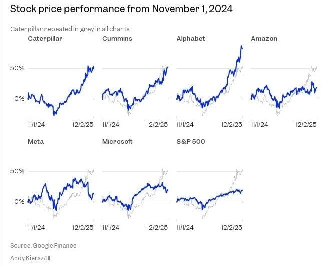 Tờ Business Insider (BI) cho hay không riêng gì Caterpillar, trong khi các hãng công nghệ lỗ ròng vì AI chưa đem về lợi nhuận thì chính những công ty phi công nghệ lại được hưởng lợi từ dòng vốn hàng trăm tỷ USD đổ vào đây, ví dụ như Primoris và Dycom Industries, những đơn vị xây dựng đường ống và hạ tầng cáp quang kết nối trung tâm dữ liệu với khí đốt tự nhiên và internet.