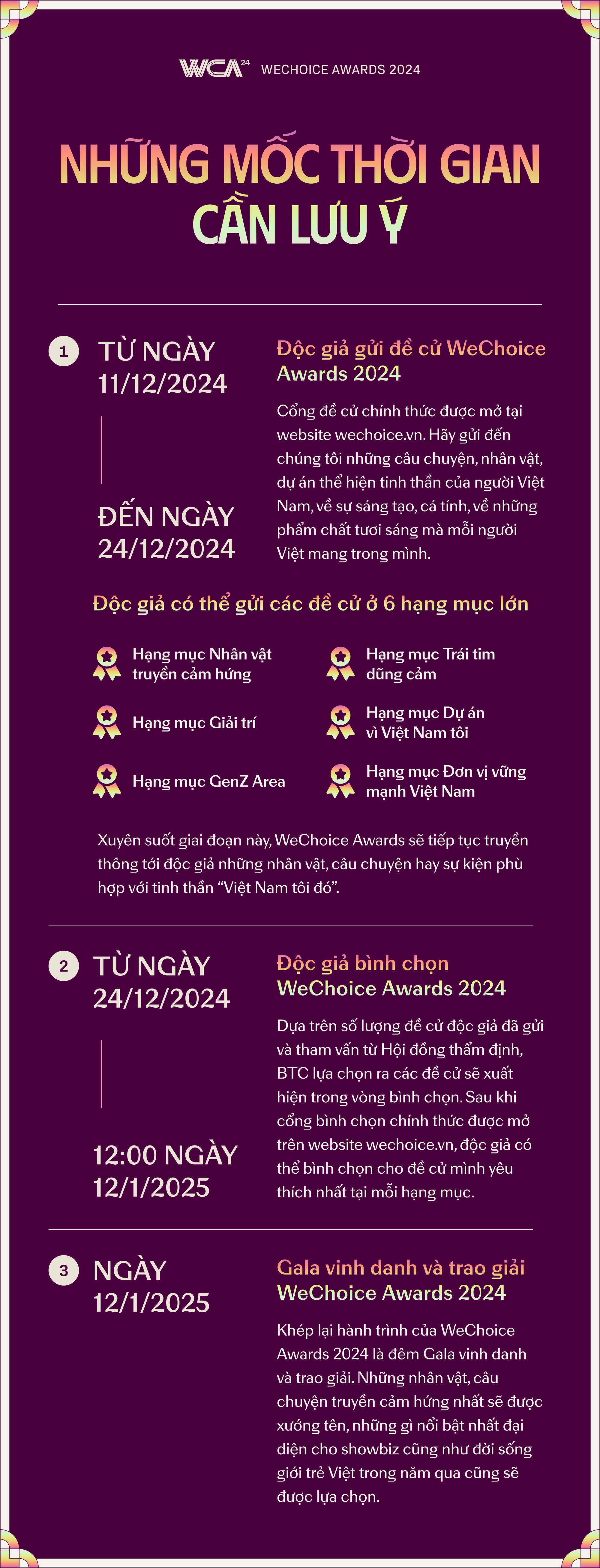 Với WeChoice Awards, năm 2024 còn rất đặc biệt khi đánh dấu cột mốc hành trình 10 năm lan tỏa niềm cảm hứng sống tới người Việt. Riêng với các khán giả - người đồng hành đáng tin trong hành trình này cũng có những cột mốc không thể bỏ lỡ. Đó chính là các mốc thời gian của WeChoice Awards 2024.