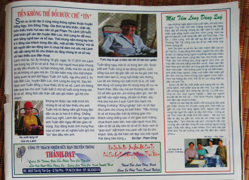 Sau một hồi trút giận, bà Thèm đưa chúng tôi xem quyển tạp chí truyền hình HTV, trong đó có bài viết về Lành và Tuấn. Hai nhà báo đã đến tận nhà yêu cầu chị Lành phải đưa cho đủ số tiền 18 triệu đồng (do chị Lành và anh Tuấn đồng ý “cưa đôi” mỗi người phải trả chín triệu đồng). Mãi đến khi chúng tôi phân tích, chứng minh thấu đáo, bà Thèm mới gọi chị Lành từ bên trong nhà bước ra. Gương mặt đầy nét hoài nghi, chị Lành nói: “Nghe nhà báo đến, tưởng đến viết báo ăn tiền nên em sợ không dám ra…”.