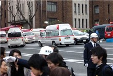 Xe cứu thương được huy động cấp cứu nạn nhân động đất bên ngoài một ngôi trường bị sập tại Kudan Kaikan. Ảnh:AFP