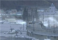 Cảnh trên truyền hình cho thấy tàu thuyền và xe cộ bị sóng thần hất văng vào cây cầu ở Kamaishi. Ảnh:BBC