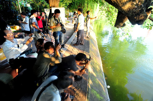 Những dải hoa lộc vừng nở đỏ thắm bên hồ Gươm (Hà Nội) mỗi buổi chiều đã thu hút nhiều nhiếp ảnh gia tìm tới sáng tác.