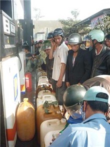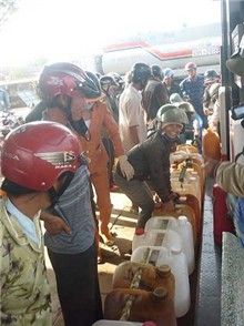Không còn dầu nhưng do quá đông người khiến họ lại phải tranh giành nhau chỗ để can chờ xe chở dầu về đổ.