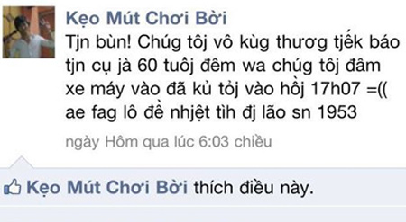 Điển hình là những câu: “Tin buồn! Chúng tôi vô cùng thương tiếc báo tin cụ già 60 tuổi đêm qua chúng tôi đâm xe máy, đã củ tỏi hồi 17h07. Anh em phang lô đề nhiệt tình đi, lão sinh năm 1953”, “Tùy mọi người thôi. Nói thật, số bọn tao đen nên đành chịu thôi. Lo hết viện phí rồi tang lễ hơn 20 triệu rồi cũng chẳng vấn đề gì. Bực nhất là nhỡ hết việc”…