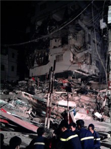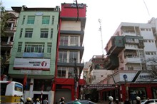 Ngôi nhà trước khi bị sập (nhà màu đỏ, nằm cạnh Ngân hàng Maritime Bank). Có thể thấy các tầng trên của ngôi nhà có vẻ lớn hơn các tầng dưới(Ảnh: Dân Trí)