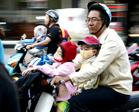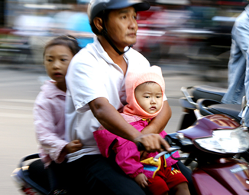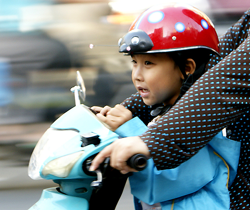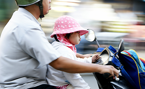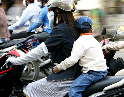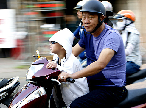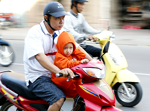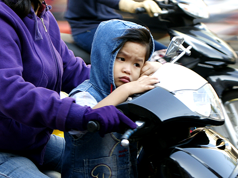 Hầu hết các bé được người lớn chở ngồi phía trước xe máy, chính vì thế mà phải chịu lạnh nhiều hơn.