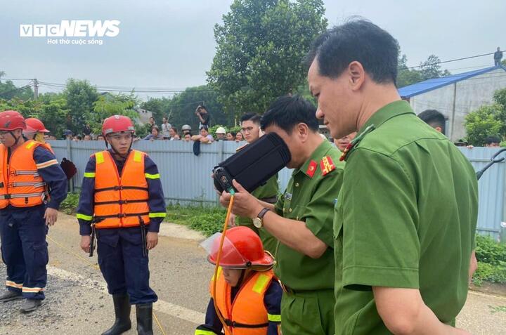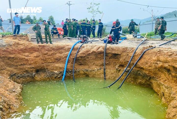 Lực lượng chức năng lắp 5 máy bơm hút nước khỏi "hố tử thần" sâu 10m, đồng thời dùng các vật dụng để tìm kiếm nạn nhân nhưng vẫn chưa thấy tung tích.