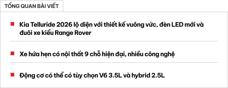 Những hình ảnh rò rỉ gần đây cho thấy Kia Telluride 2026 thử nghiệm đang trong giai đoạn phát triển cuối cùng, báo hiệu một màn ra mắt chính thức có thể diễn ra trong vài tháng tới. Thay vì chờ đợi, chúng ta hãy cùng khám phá những thông tin đã biết về mẫu xe này, từ thiết kế, nội thất đến hệ truyền động.