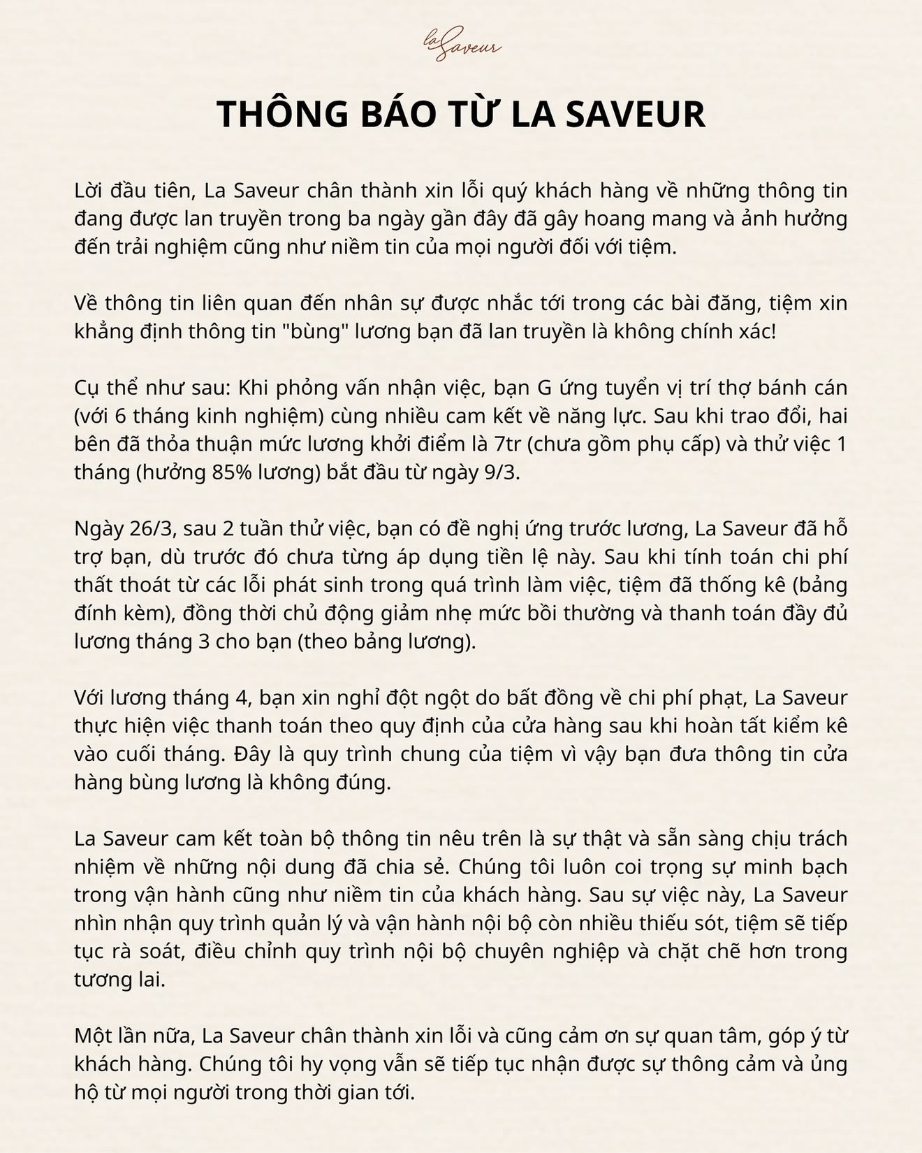 Theo thông tin từ cửa hàng, việc chậm trễ thanh toán lương tháng 4 như thông tin lan truyền thực tế là do nhân viên này xin nghỉ đột ngột vì bất đồng về các khoản chi phí phạt. Phía tiệm khẳng định việc thanh toán sẽ được thực hiện đúng quy định sau khi hoàn tất kiểm kê cuối tháng, đồng thời bác bỏ thông tin cho rằng cửa hàng bùng lương của người lao động.